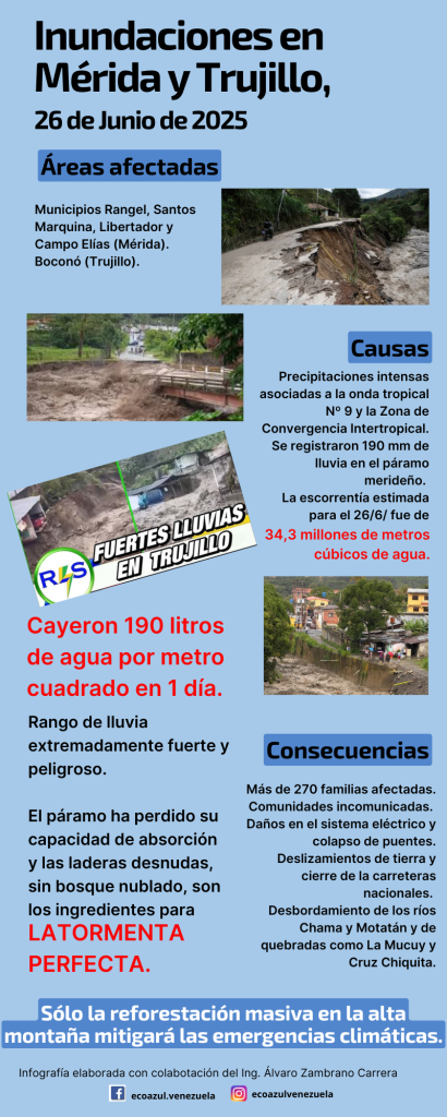 Por eso hemos preparado algunas infografías en colaboración con el Ingeniero Álvaro Zambrano, Consultor Ambiental, para explicar cómo el volumen extraordinario de escorrentía contribuyó al desbordamiento de los ríos andinos, sus causas y consecuencias. Mucho agradeceríamos que nos ayudaran a difundirlas en la medida de sus posibilidades. Es información científica que debiera ser entendida por la población para que, como sociedad, corrijamos el rumbo.