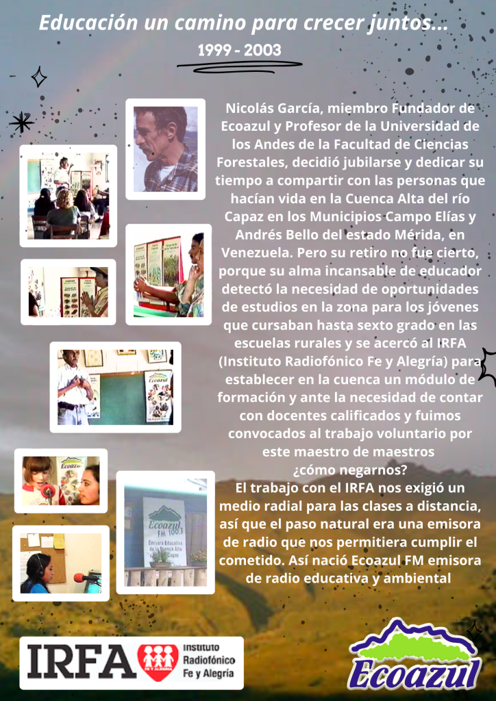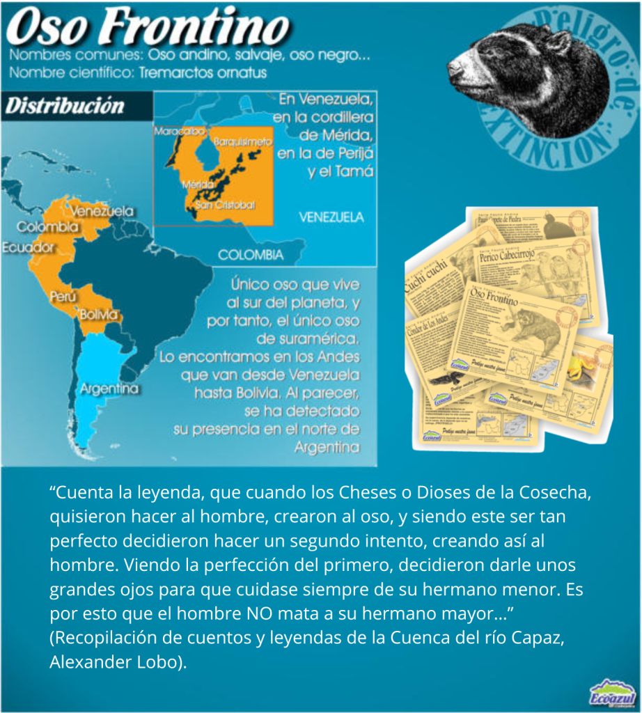 Los bosques nublados de los Andes venezolanos albergan una variada diversidad de especies animales y vegetales de vital importancia para la vida de estos ecosistemas, que no escapan a la depredación humana. Es fundamental educar y sensibilizar a nuestra sociedad sobre el valor de preservación de estas especies. El Oso Andino (Tremarctus ornatus) es el primer número de la Serie Fauna Andina, una campaña divulgativa a través de impresos y micros radiales, en la que Ecoazul promueve el conocimiento de especies propias de nuestros ecosistemas, amenazadas o en peligro de extinción. El oso ha acompañado a Ecoazul en cada paso de su recorrido, no sólo es el Señor de los Bosques, también es nuestro hermano Mayor y emblema de nuestras esperanzas. Este Oso de Anteojos, como también se le conoce, por sus singulares manchas blancas alrededor de sus ojos, fue el símbolo del bosque por el cual se vincularon los fundadores de Ecoazul, a finales de los años ochenta del siglo XX. Desde entonces, hemos desarrollado un trabajo de educación y divulgación de esta especie emblemática de los Andes. En un principio se trabajó con los cazadores para contribuir a reducir la cacería de los osos en nuestras montañas, se obtuvieron buenos resultados demostrándoles que el oso no era una amenaza, sino un aliado para la vida del bosque, pero el mayor aprendizaje fue la comprensión de la necesidad de llevar el mensaje a los espacios del futuro: las aulas escolares, allí está la esperanza de un mejor futuro.